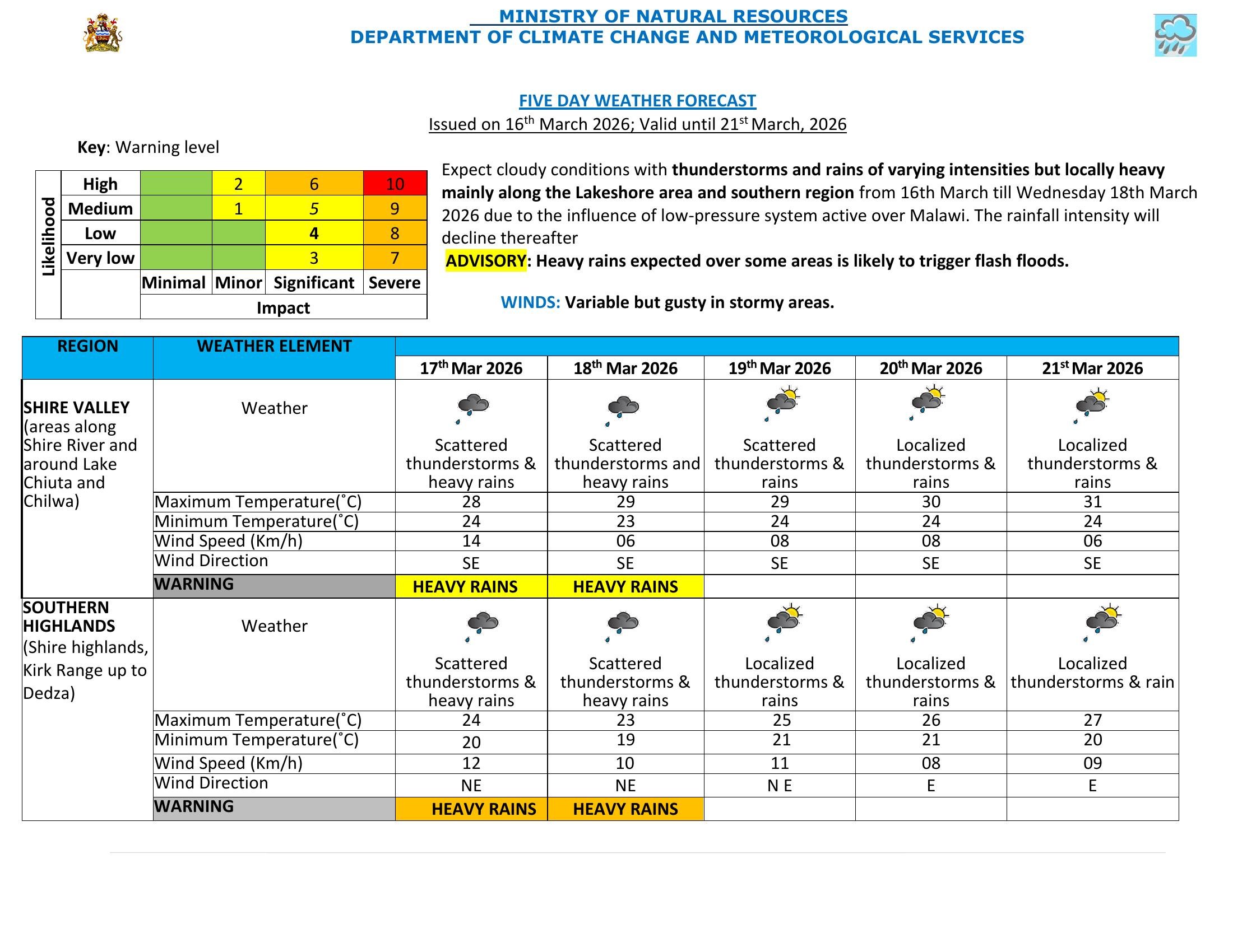 Update: The Department of Climate Change and Meteorological Services issued fresh weather warnings on March 16, cautioning that heavy rains and thunderstorms will persist across Malawi. According to the department's advisory, the conditions are driven by an active low-pressure system over the country. The lakeshore and southern regions are expected to experience the most intense weather, with localized heavy downpours and a continued risk of flash floods lasting through Wednesday, March 18.